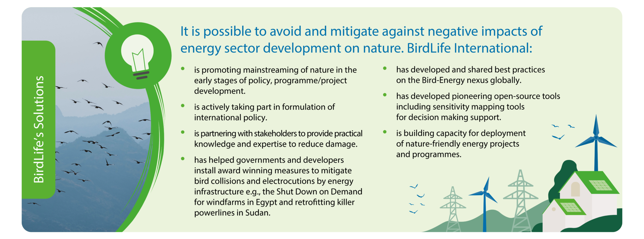 Across Africa, migratory flyways are under growing a threat: energy developments. Africa has the lowest access to electricity per capita; more than 600 million people have no access to electricity. With energy needs and demands on rise, the development of energy infrastructure across the continent, can have a negative impact on birds and nature. Every year, millions of birds die from electrocution or collision with poorly sited and designed energy infrastructure, leading to power disruptions and economic losses worth millions of dollars.