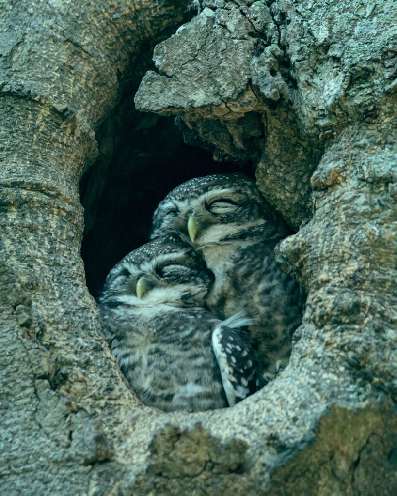 Courtship and pair-bonding behaviours can involve preening, cheek rubbing, or dual hooting. How long their bond lasts depend on the species. For some it will just be for the season or year, whereas others, such as Tawny and Screech owls (both Typical owls), will mate for life. Owls don’t tend to build their own nests, and may instead take over abandoned nests, or nest in tree holes, cliffs, or undisturbed buildings. Once the female has laid eggs, she will not leave the nest until they hatch, which can take up to 32 days, so relies on her mate to bring food. Once hatched, chicks will compete with one another for food and if food is scarce, younger, weaker chicks may be left to starve to death. Most young owls will fledge at around two months old, and once they are capable of flying solo, parental care will cease. It’s a tough world to navigate for young owls and around half don’t make it to their first birthday.