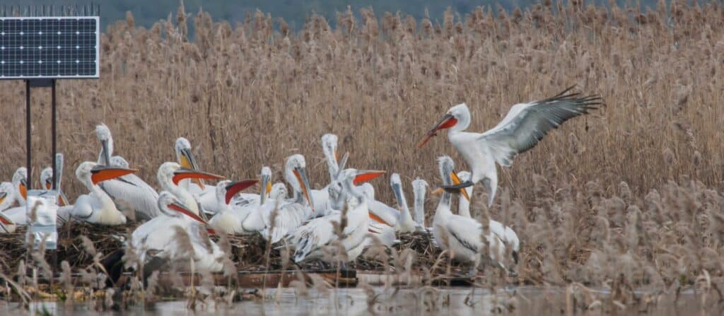 Unbeknownst to the flirting pelicans, their displays are being watched. You see, despite their huge size, Dalmatian Pelicans are very susceptible to disturbance and its global population is declining. So, night and day, conservationists are observing them from afar, having set up a brand new video-monitoring system – as part of a regional programme led by Noé Conservation supported by the Critical Ecosystem Partnership Fund (CEPF), MAVA and other donors.