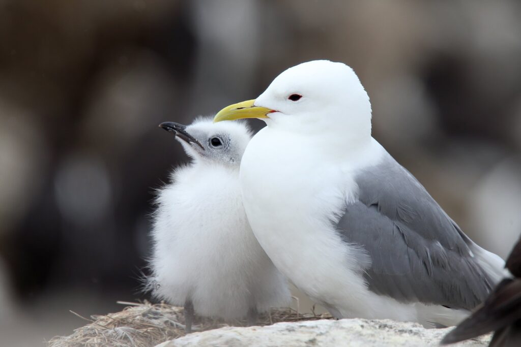 Human driven activities are impacting Kittiwakes breeding: parents are unable to find sufficient fish to feed their chicks as overfishing and climate change drive their main prey (sandeels and capelins) further North from their nesting cliffs. These birds are stuck between a rock and a hard place. In a bid to survive, they can either switch to different prey or try to follow their preferred food further North. Both options will negatively impact their breeding success as parents must exert more effort for the same level of nutrition, until they cannot sustain their chicks’ needs anymore, which will ultimately starve to death. In order to protect these seabirds, it is crucial that we do more monitoring of the other threats these seabirds face in their wintering grounds, such as overfishing, marine pollution and bycatch to guarantee Kittiwakes have good quality wintering areas. This is essential to allow them to breed successfully and stop them from heading towards extinction.