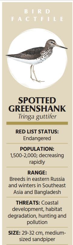 Spotted Greenshank is a worthy focus as it numbers “among the world’s most threatened shorebirds,” says Ding Li Yong, BirdLife’s Flyways Co-ordinator for Asia. Classified as Endangered, perhaps fewer than 1,500 remain. Worse, its population decline is ongoing, driven principally by habitat loss and degradation at unprotected sites. Such threats are especially worrisome given that Spotted Greenshank’s tightly confined distribution offers little safety net: it breeds solely in a small area neighbouring Russia’s remote coast where, fascinatingly, it builds its own nests (a unique behaviour among shorebirds) in larch trees.
