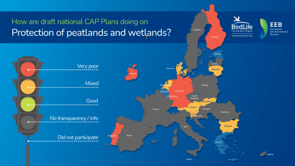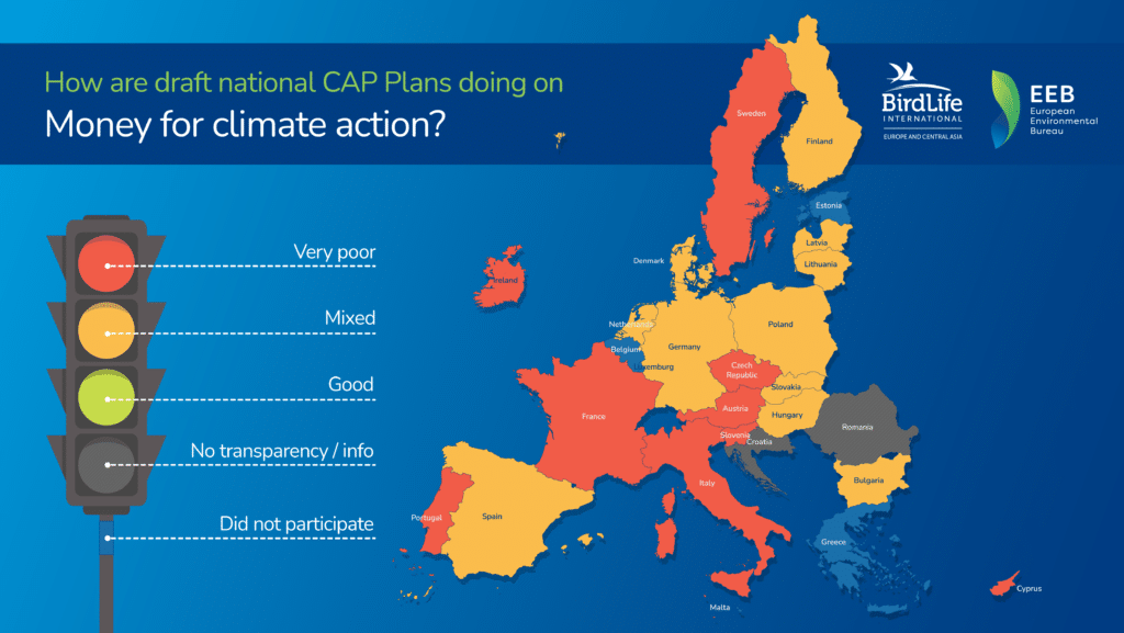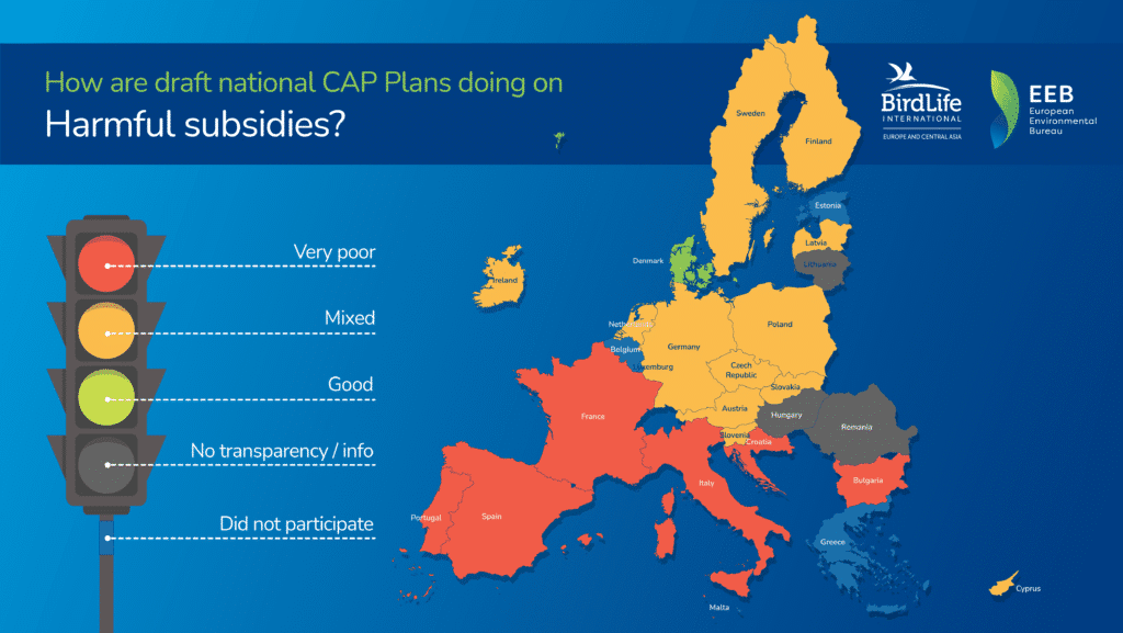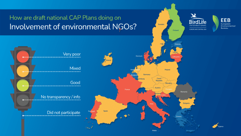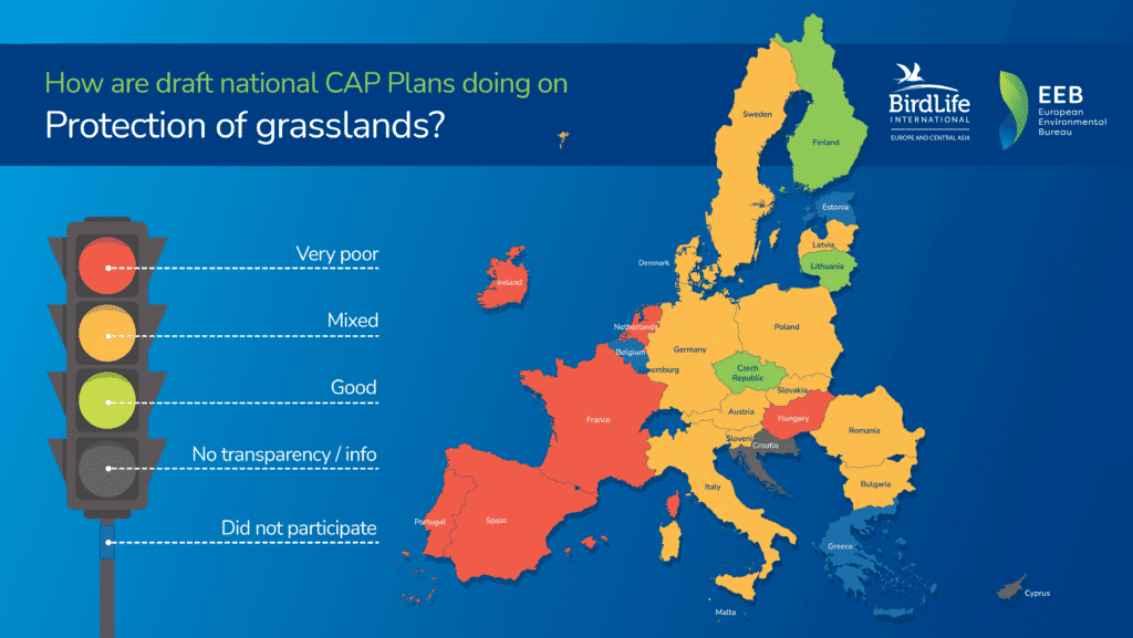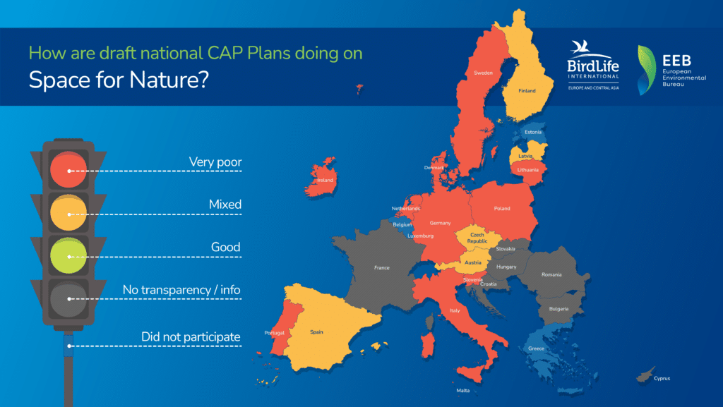 BirdLife Europe and the European Environmental Bureau (EEB) have worked with agriculture experts to understand what is really happening on the ground. National experts from 22 countries screened the available drafts against seven key criteria stemming from the EEB’s 10 Tests for a Green Deal-compatible CAP. Based on multiple-choice questions, this assessment was translated into a traffic light benchmarking system of how countries score on each criterion. Our snapshot of the ambition of the national CAP Strategic Plans is based on the best available information by the 10th of November, and the final assessment might be different.