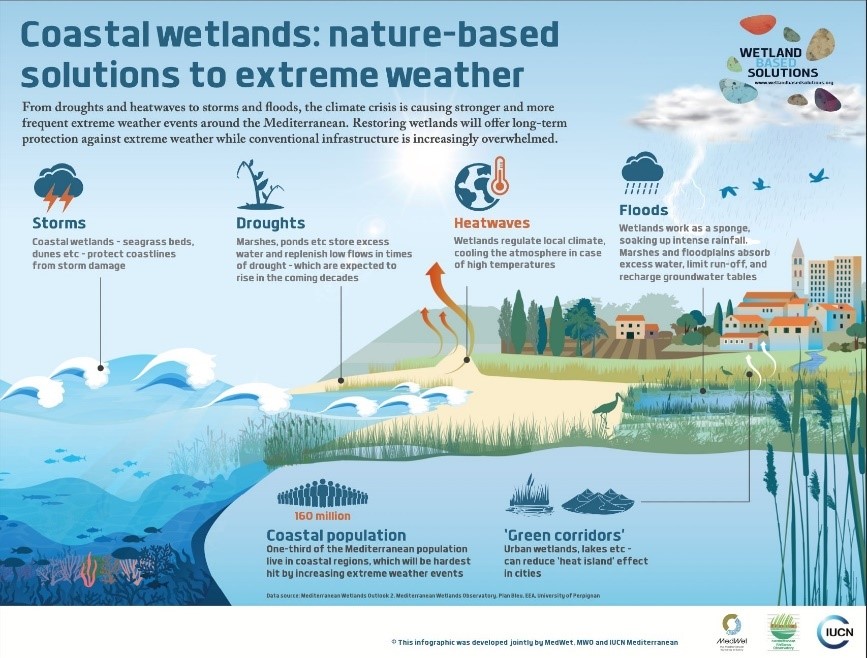 Wetlands are found all over the world and include ecosystems such as swamps, marshes, lakes, lagoons, mangroves, coral reefs, and peatlands. To some up just a few of their benefits: they purify and store water, they reduce the impact of floods and coastal erosion, and they provide habitats for wildlife and plants. They are particularly important in Mediterranean coastal areas: they occupy approximately 2% of the total surface of the Mediterranean while hosting more than 30% of the basin’s vertebrate species.