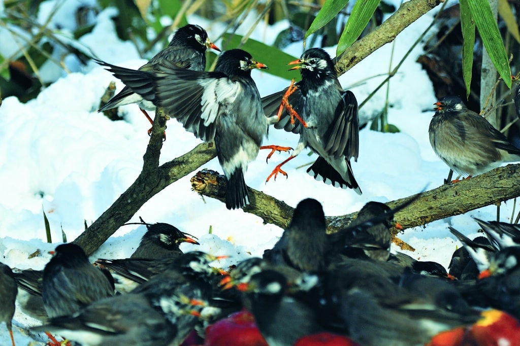 White-cheeked Starlings are familiar birds to people across Japan and their association with human life dates back to ancient times. In the spring, summer and autumn, they feed mainly on insects and earthworms, making them beneficial to humans. From late autumn to winter, as insects and other food sources become unavailable, their diets shift towards fruit. This has led to them sometimes being labeled as pests, given their fondness for commonly harvested fruits such as persimmons and apples. This label, however, is somewhat unfortunate and misleading because they do not become fully-fledged fruit-eaters until the harvest season is over. What they mainly eat are in fact persimmons left on trees and already-fallen apples.
