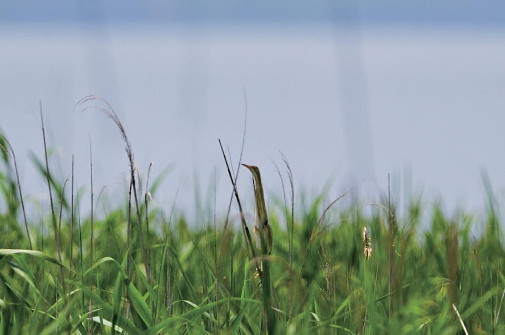 Can you see the Yellow Bittern in the centre of the photo on the left below? These birds skilfully navigate reed beds like ninjas, have a plain appearance, and often camouflage themselves within the reeds, stretching their necks in a way to make themselves less conspicuous. As well as being an alert and evasive behaviour, this is also useful when ambushing prey at the water’s edge.