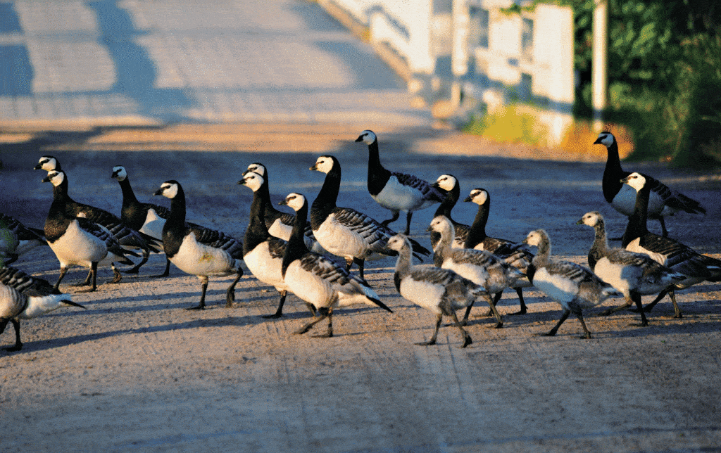 Photographed in Finland, this flock landed in a park near a city centre early in the morning, where they scattered and started grazing. This photo shows a group of geese with three- to four-week-old chicks returning to the sea. In Greenland, they build nests on cliffs as high as 100 metres along the coast to avoid foxes and other predators. It is well known that their chicks, which have just hatched and cannot yet fly, are encouraged by their parents to jump for their lives off these cliffs for their first flight.