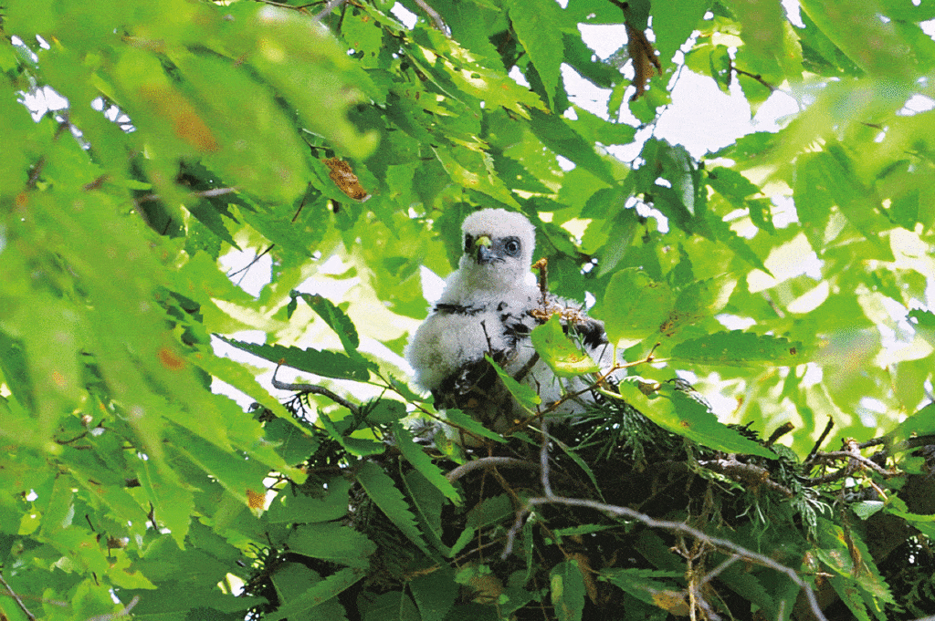The chick looked at me, as if to say,” What are you doing?”. It’s been about 30 days since it hatched and having just left the nest, its white fluffy feathers and dull black eyes are adorable. After leaving the nest, for a while the parents will watch over their chicks closely during the day to prevent them from being attacked by crows and other natural predators. After three months, the chicks become independent and move away from their parents’ territory.