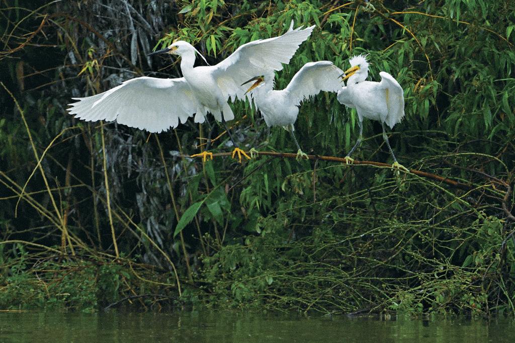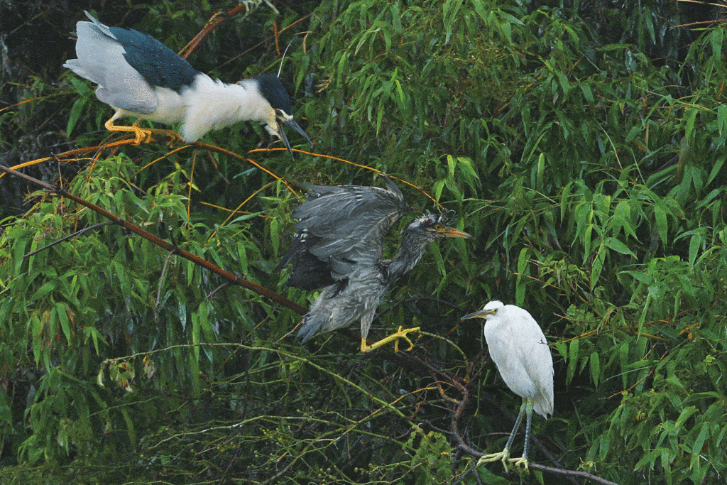 The chicks on the right are begging for more food, and the parent is about to fly off again to catch them some. Chicks from the Ardeidae Family are fiercely hungry, and in this instance, so eager to eat it’s as if they are almost ready to eat the heads of their parents.