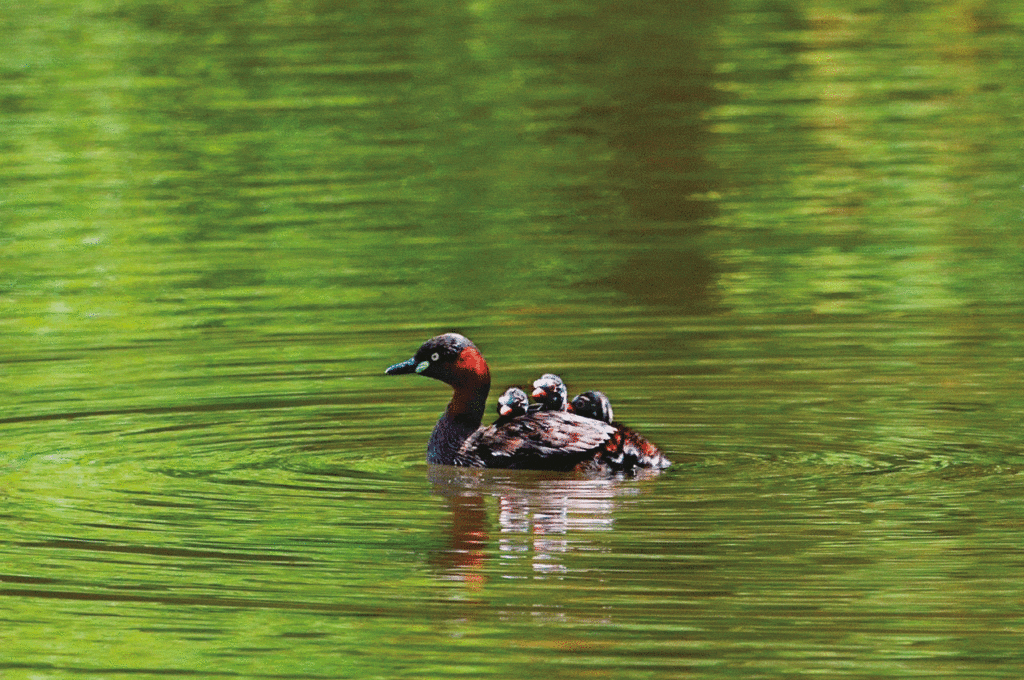 Little Grebes breeds annually in the Akasaka Imperial Estate. Pairs build nests that float on the surface of the water to lay their eggs, which are taken care of by both the male and female. Once the chicks leave the nest with their parents shortly after hatching, they do not return. This photograph shows the chicks on the seventh day after hatching. Although they are good swimmers, they still often ride on the backs of their parents. To feed them, parents catch and bring small fish and aquatic insects, and the chicks improve their diving with each passing day. I almost applauded when one caught an insect a few days later!