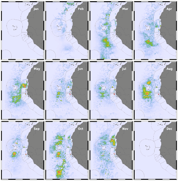 At sea, these animals interact with various fishing gears leading to increased mortality and population reductions. The distribution of these species, especially seabirds, in the country over- laps with large numbers of semi-industrial and artisanal fishing vessels as well as national and international industrial fishing fleets. The fishing vessels use a variety of gears including longlines, purse seines and gillnets, which accidentally catch sea turtles and seabirds, otherwise known as bycatch.