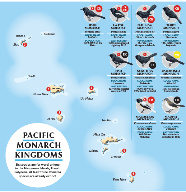 Fatu Hiva Monarch’s population has crashed since Black Rats arrived on ships in recent decades and quickly began raiding nests. This is sadly a familiar story across Pacific islands and for the Pomarea genus of monarch flycatchers to which the species belongs [see map]: of the nine species, three (and likely a fourth) went extinct in the last century.