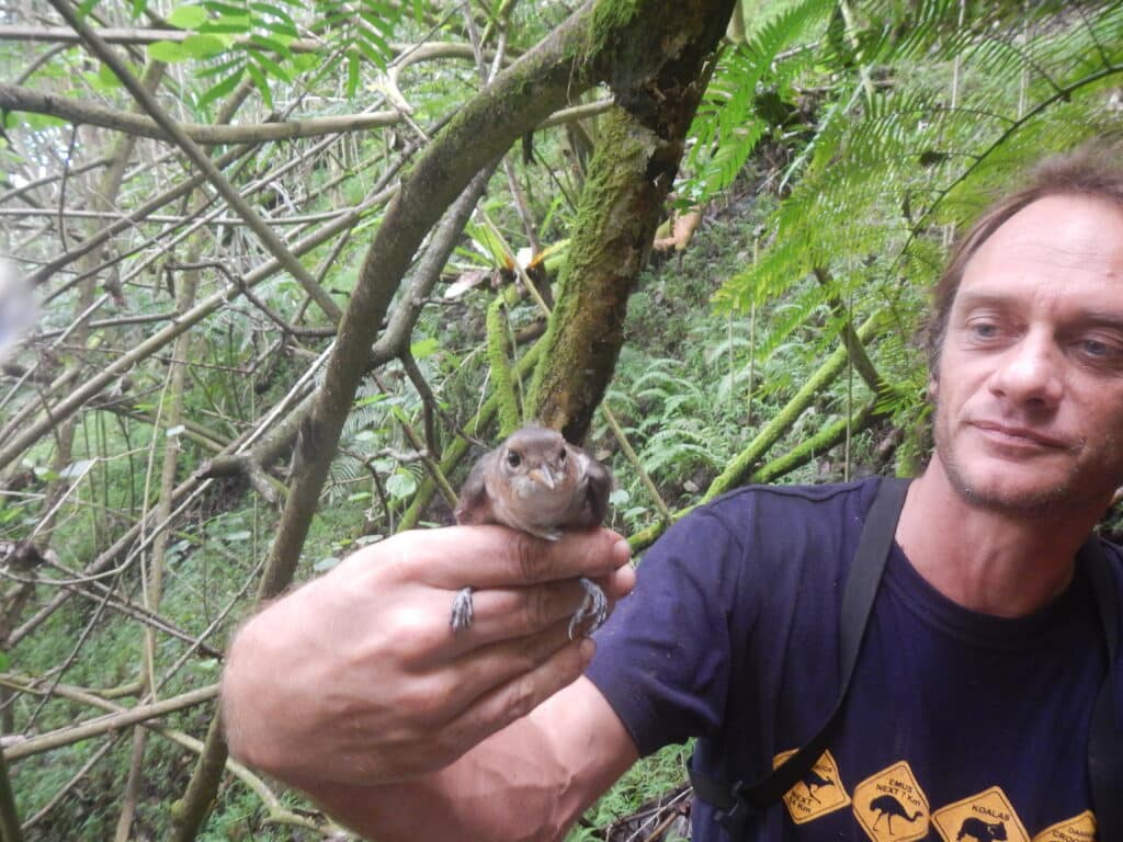 How does it feel to look a bird in the eye and know that the entire species would have gone extinct without your help? As Thomas Ghestemme puts some mealworms onto a feeding station, a young Fatu Hiva Monarch tilts its head inquisitively, looks at him and takes the food. Watching the bird flutter off, Ghestemme’s eyes show a mix of emotions: relief, fascination and hope. However, his frown also betrays deep concern. For Ghestemme and his Polynesian colleagues, contemplating a species’ existence when out in the field is a regular occurrence rather than an emotional experience.