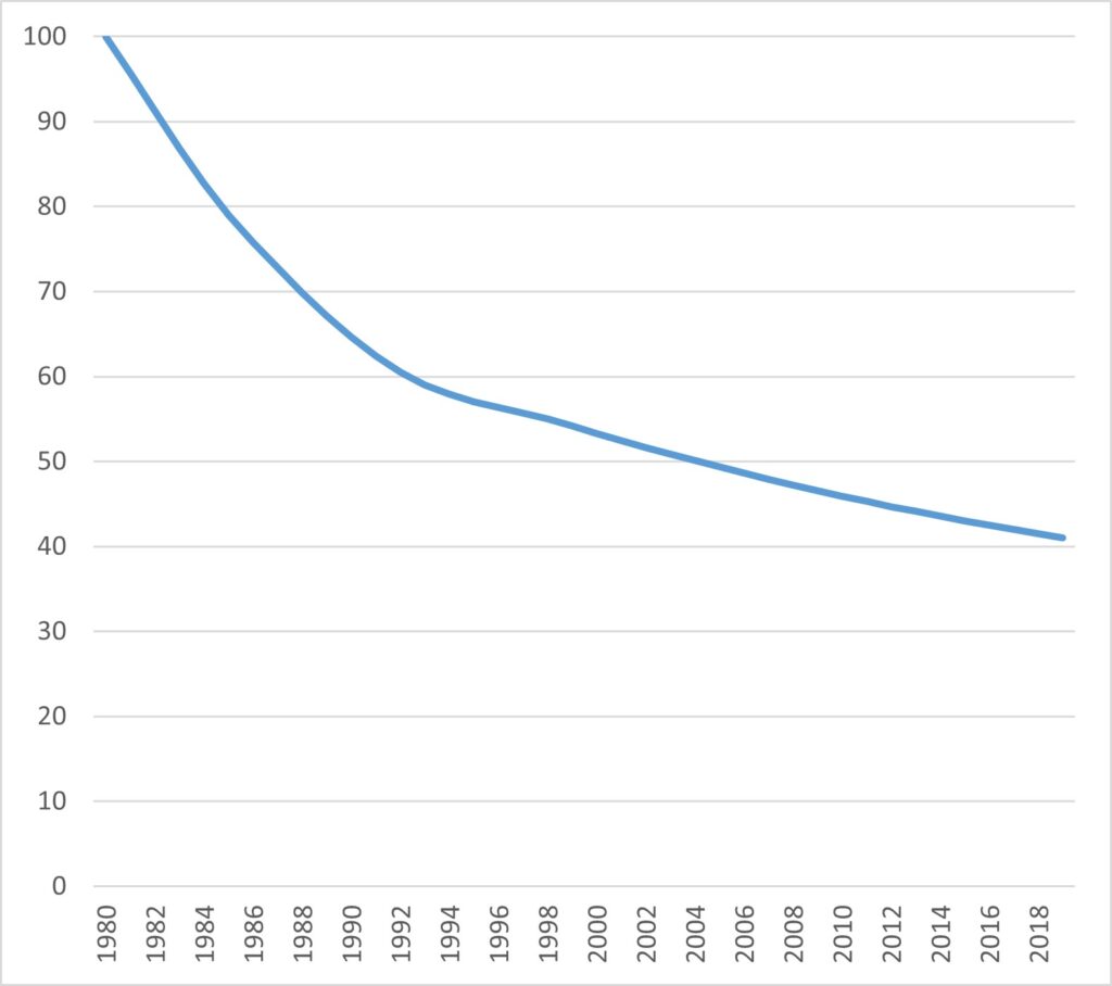 The EU common farmland birds indicator for 1980-2019 combines the population trends of 39 species, some of which are increasing but most of which are in decline, to produce an overall indicator for the 40-year period.