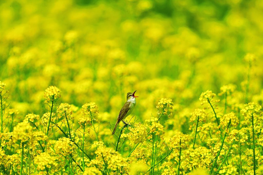 The cover photo is of a Great Reed-warbler; this species has a reddish mouth and makes a piercing call. This bird seemed to find it difficult to keep a good balance as the rape blossoms fluttered greatly whenever the wind blew, but it continued to sing, changing its direction from time to time.