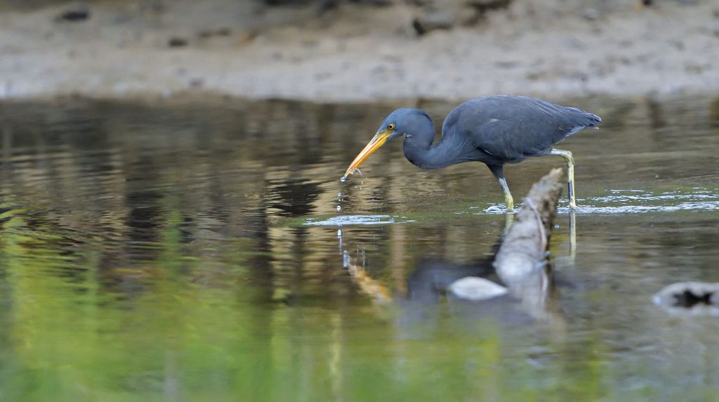 The next is a “Kurosagi” (“Kuro” means “black” in Japanese. English name Pacific Reef-Egret or sometimes Reef Heron), which is found on coastal reefs. I first encountered them roughly 35 years ago, when I was birdwatching from a boat while Prince Norihito Takamado was diving. There was a white egret among the black egrets on the reef, and I asked my companion what it was called; the answer was “a white specimen of the black egret!” The name says it all, but that is indeed not this case. I muttered to myself, “Isn’t this a scam?” (Another Japanese word that is also pronounced “sagi” means scam!)