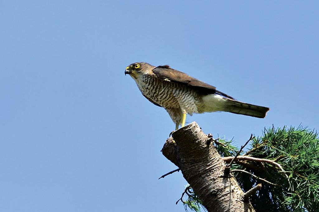 This is “Tsumi” (written in kanji as 雀鷹. The character 雀 represents “sparrow”, often implies something small. The character 鷹 represents “hawk”. English name: Japanese Sparrowhawk.) Although it looks large in the photo, this is the smallest bird of prey in Japan. The female in the photo is about the size of an Oriental Turtle-Dove, while a male is only about the size of a Brown-eared Bulbul. Even so, they are excellent hunters. When they are heard, the predatory birds instantly stop singing and remain still in the shadows. As the female and male were once thought to be different species, the female’s Japanese name was “Tsumi” (雀鷹), whereas the male’s was “Etsuya” (written in kanji as悦哉). I am curious as to why the name chosen was the female example.