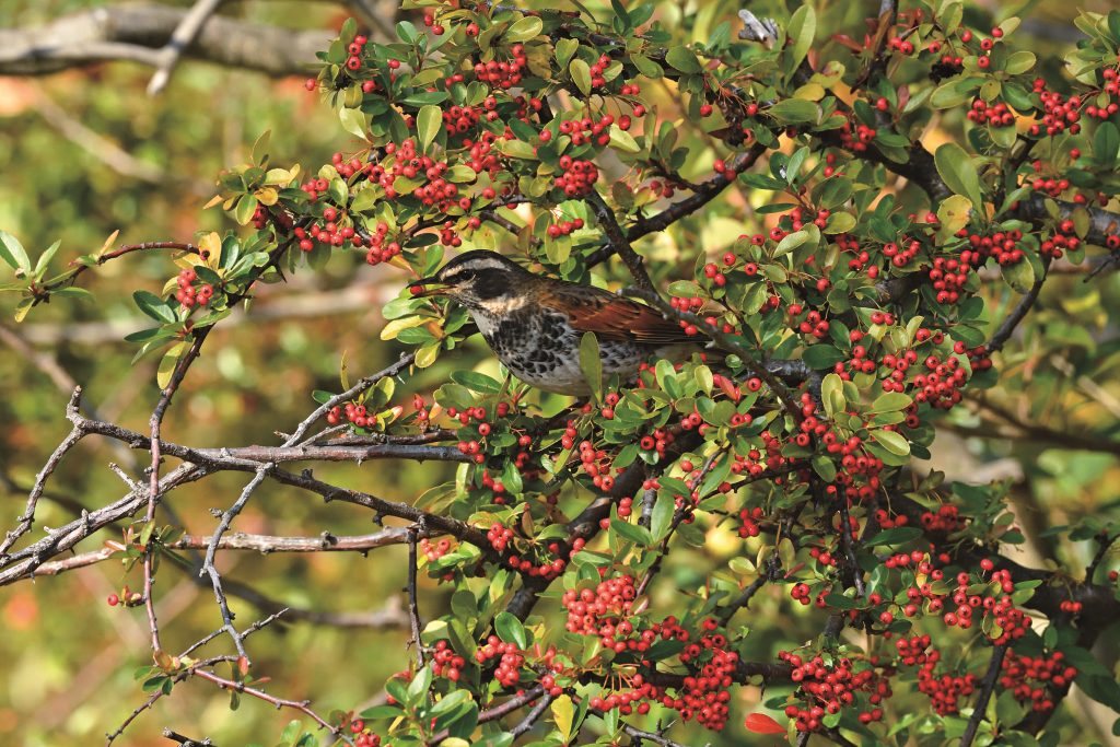 When berries and nuts ripen in late fall and winter, birds are attracted to them. Most of the berries found in the fields and mountains during this season are red, as are Pyracantha and Viburnum awabuki in parks. Roadside tress such as Benthamidia florida and Sorbus commixta also bear small red berries about the size of a centimeter. From the plant’s point of view, it is a strategy to make its fruits conspicuous so that many birds will peck at them and contribute to seed dispersal. At the same time, they provide a source of nourishment for birds to survive the winter.