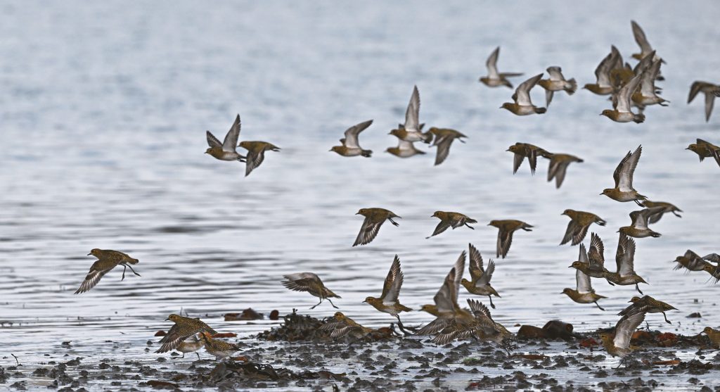 The second photo (above) captures the moment when the flock took flight after being startled by people who had come down to the shore. If you look closely, you can see that the Eurasian Golden Plover has white underwings and relatively short legs, so the tips of its toes do not extend beyond the tail feathers during flight. This flock circled in the air for quite some time before returning to the same beach, which was probably one of the birds’ favourite feeding grounds.