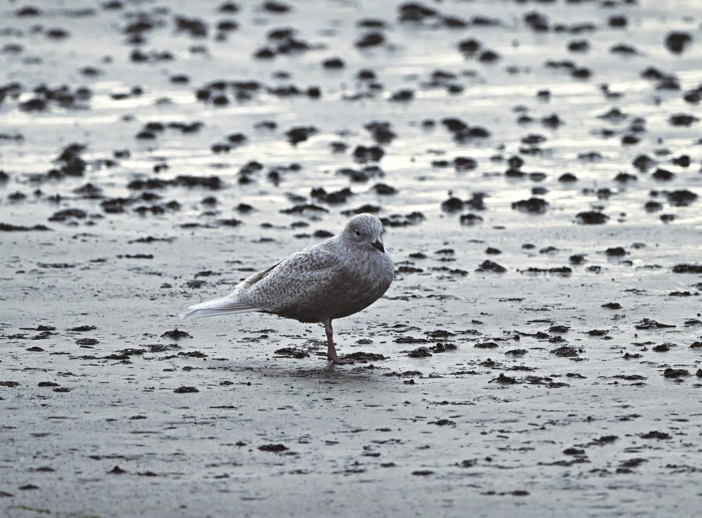 The photograph above shows a juvenile Iceland Gull. Compared to juveniles of other gull species, it is a much paler grey, giving a gentle impression. Before finding this young bird, I was also able to see the adults. When the Eurasian Golden Plovers took off, several gulls were resting with their eyes closed in the background. The adults were an overall very pale grey, and they appeared noticeably smaller than species such as European Herring Gull.