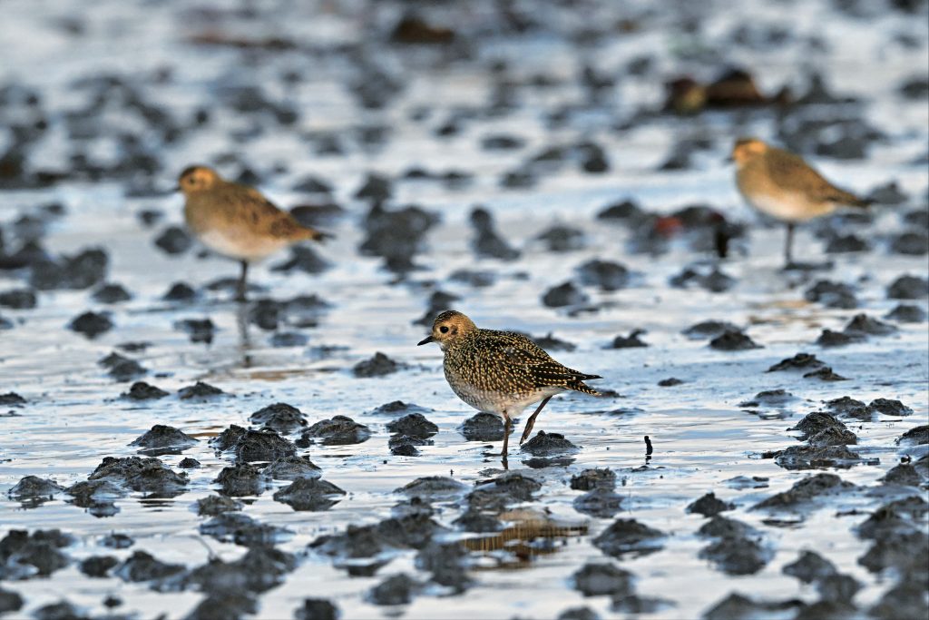 This species breeds in Arctic regions from Norway and Finland to the western part of Russia’s Taimyr Peninsula, and winters along the coasts of western Europe and the Mediterranean. In Japan, it has been recorded in Okinawa and Ishikawa. It is slightly larger and has shorter legs than the Pacific Golden Plover that migrates to Japan, giving a stockier impression. Its call sounds like “hee” or “pyoo,” which is quite different from the “kyobii” or “pyurii” calls of Pacific Golden Plover.